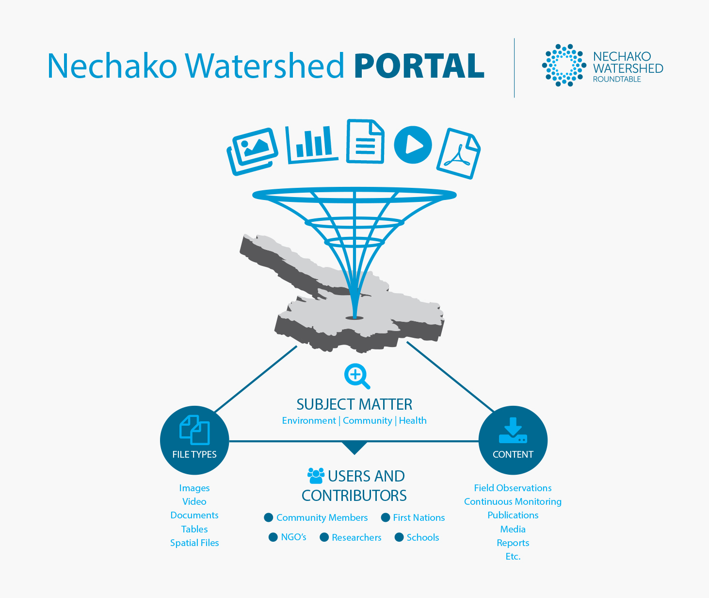 This ‘made in the Nechako’ portal tool has been developed by the team members and research partnerships linked to UNBC’s Integrated Watershed Research Group and is now being expanded and enhanced through closer collaboration with the Nechako Watershed Roundtable. There is a wide variety of data, information and resources that can be shared through the portal, and anyone submitting or sharing information in the Nechako Watershed portal has full control over who can see their submissions.